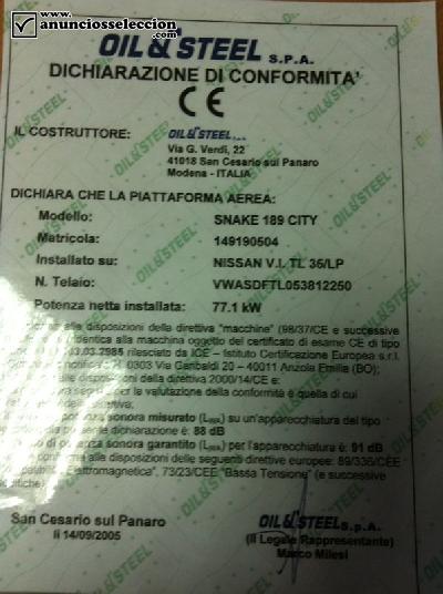 Oferta CamiónMarca: NISSAN Modelo: CABSTAR Kilómetros: 22.000 Año: 2005 Color: BLANCO Combustible: Gasoleo País: ESPAÑA Provincia: Ciudad: MOSTOLES Estado: REACONDICIONADO Horario de contacto: Descripción: Versión: articulada Marca: Oil&Steel Modelo: Scorpion 189 Motor: Diesel Año: 2. 005 Descripción: Camion cesta articulado de 18 metros de Precio: € |